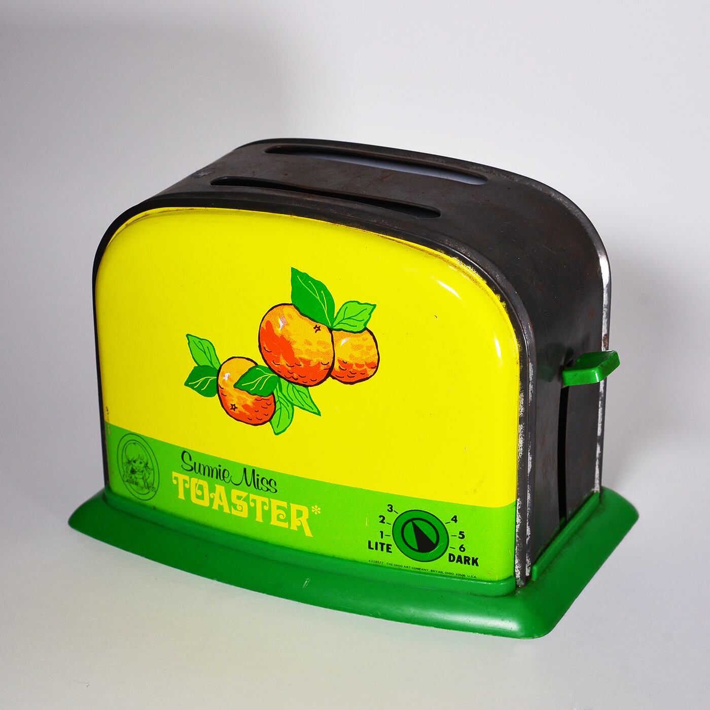 部屋のインテリアとして使えるSunny Miss Toasterです。60年-79年代の物なのでサビは目立ちますが、焼けは少なく印刷面は濃い色のまま残ってます。